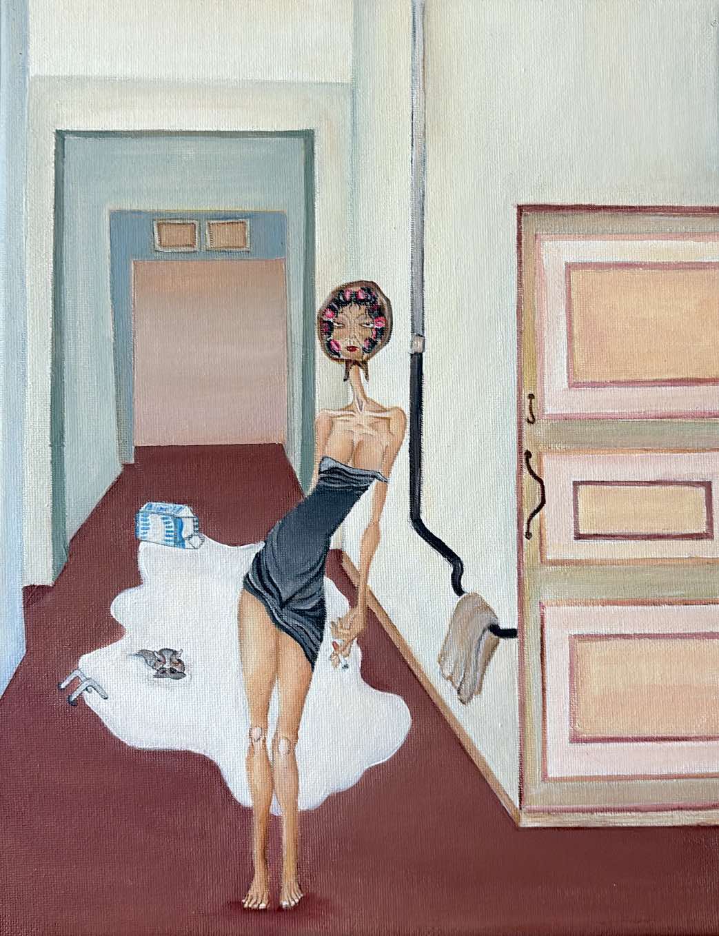 The time I put into this piece is wildly inappropriate for the sheer simplicity it holds... I must say I am so proud of the result. I feel I've perfectly captured those midnight munchie looks, or when you are angry and your clothes get caught on something or when I think of eating at the pool. Or that weird phase of feelings when you're not holding on to old feelings you just haven't found any new ones yet. I thought of this moment in a reaction to being overwhelmed and starved. To be able to just take my things and go is so powerful. So simple... i somehow can't master it so I paint it and paint it again in so many different ways in way to many homes.