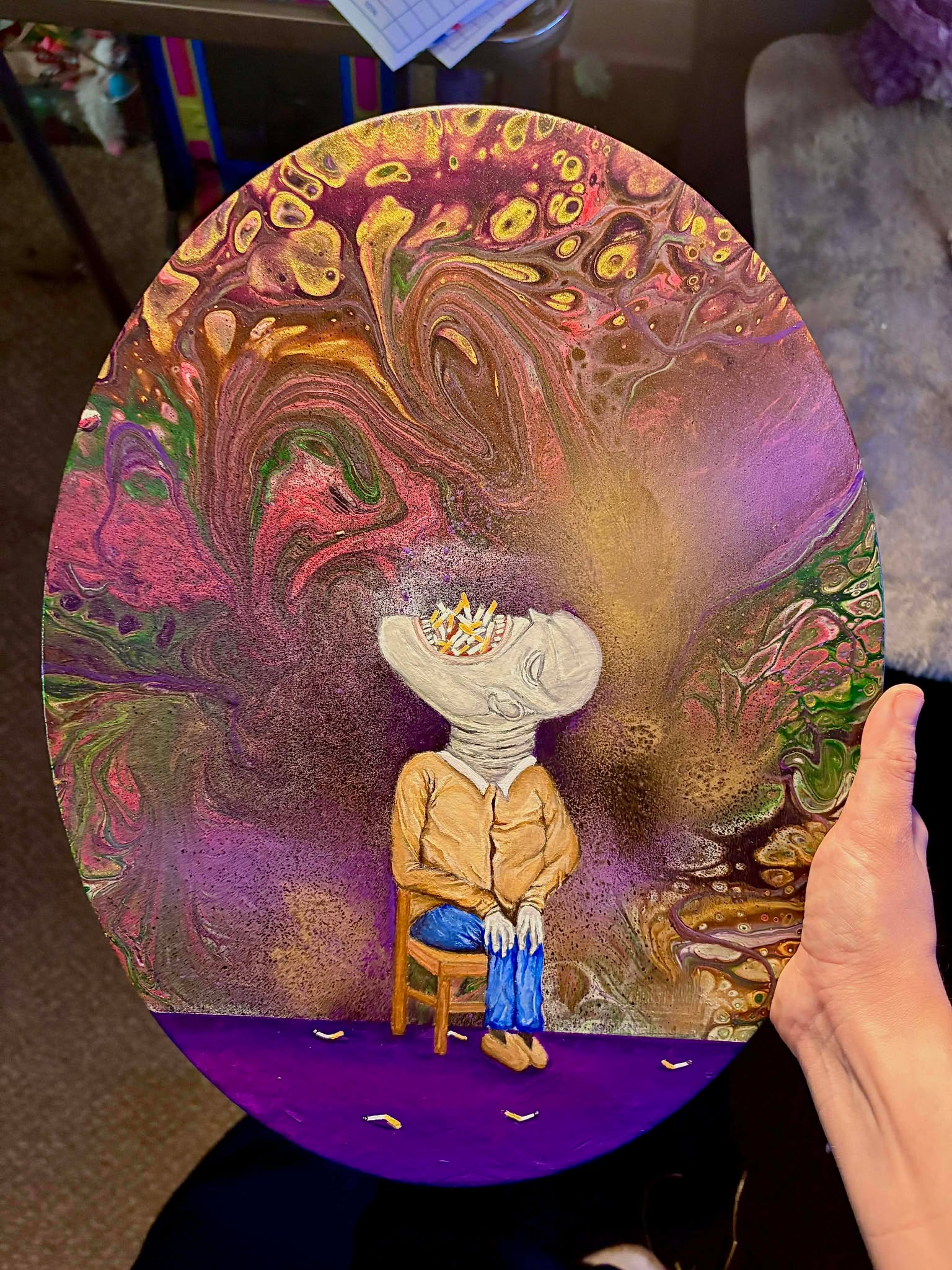 this is a simple painting but everything's simple when it's a tragedy. When you're starving for something more than food nicotine tastes like a last death row meal. cheers to a painting of watching someone almost become everything they were supposed to.