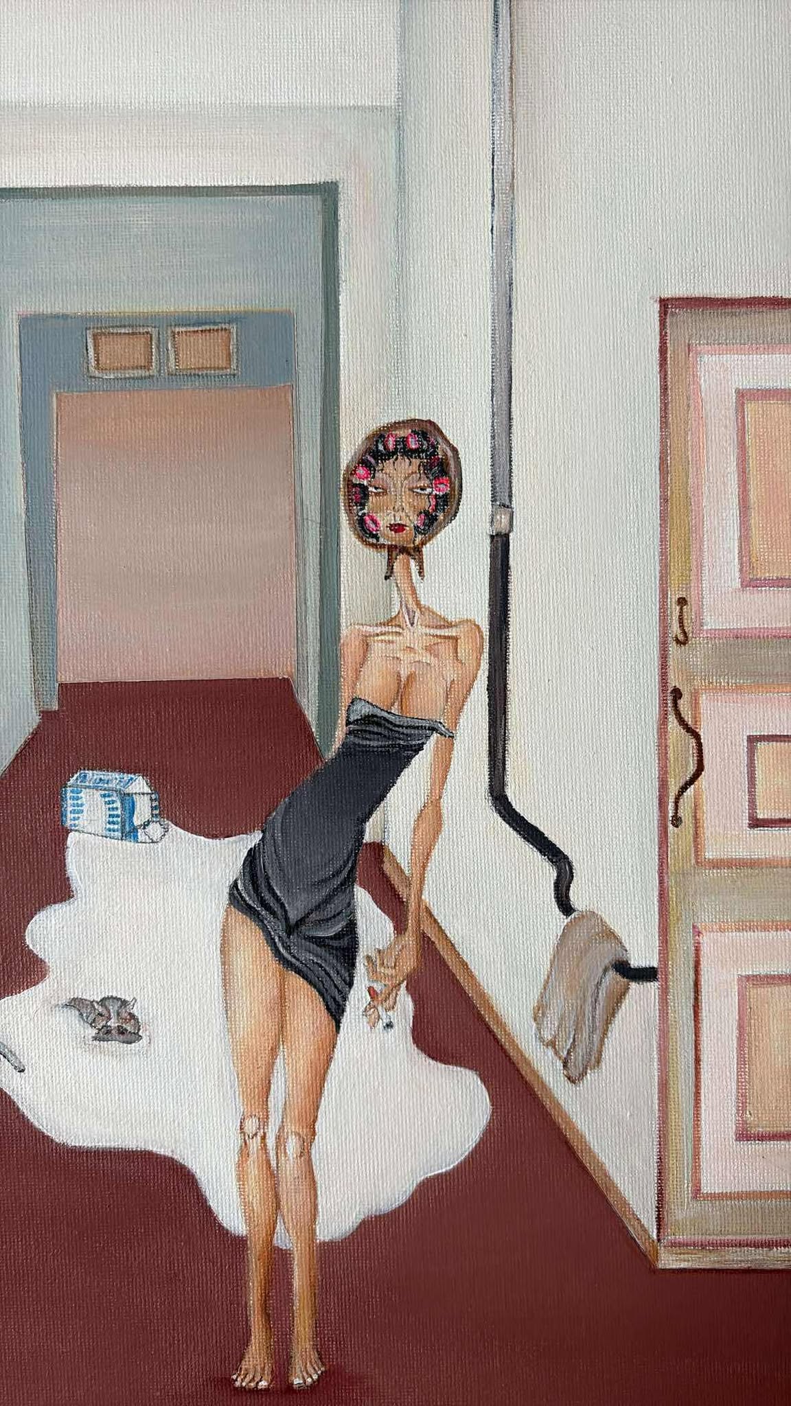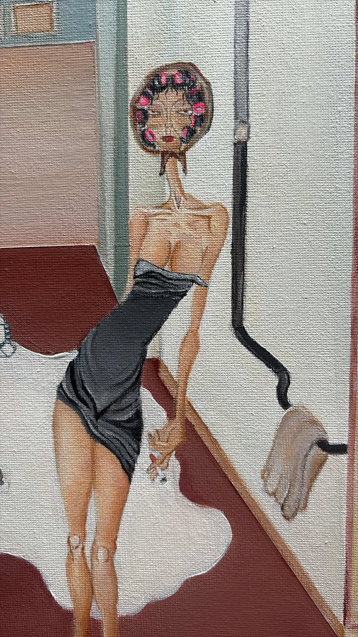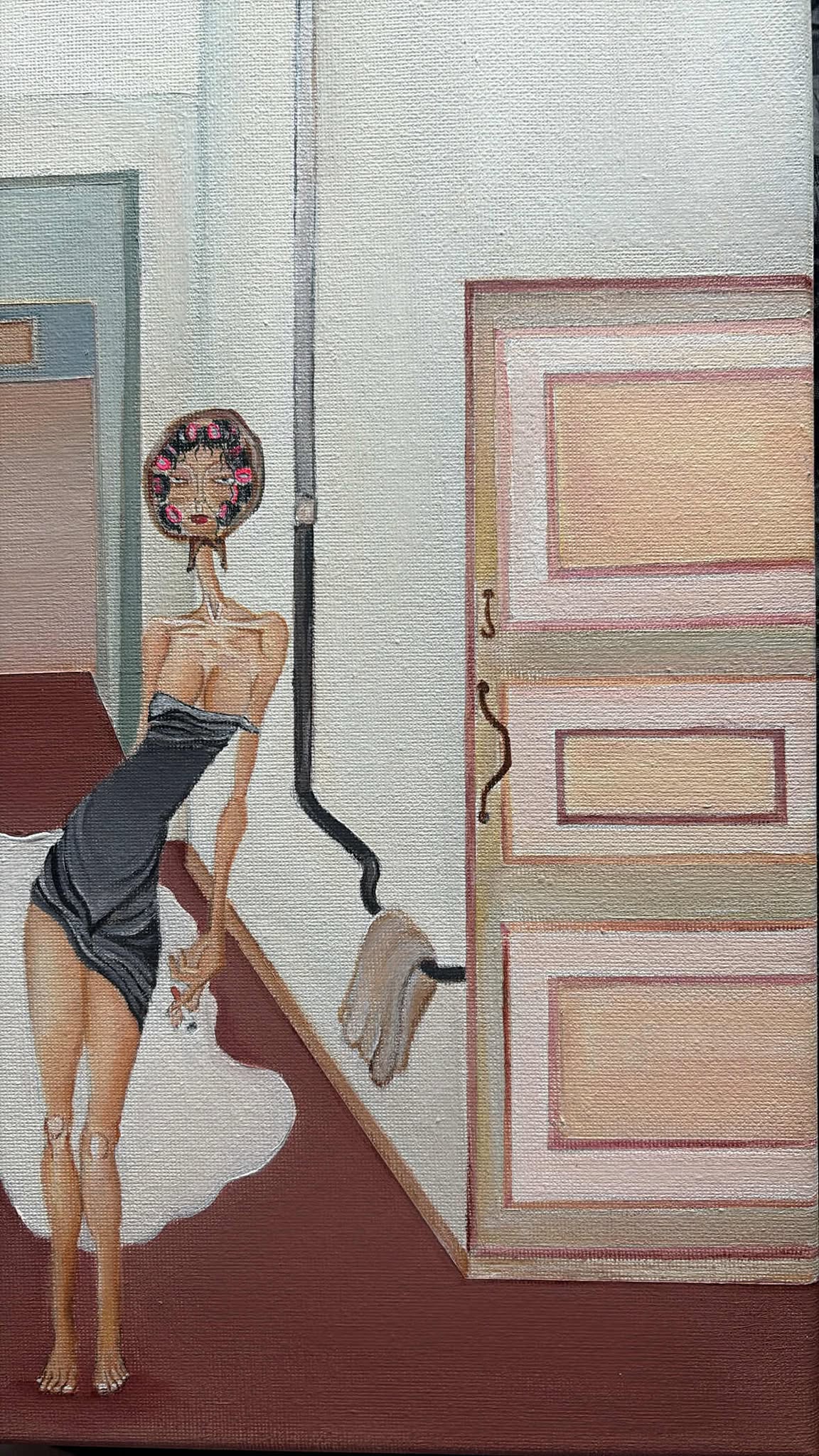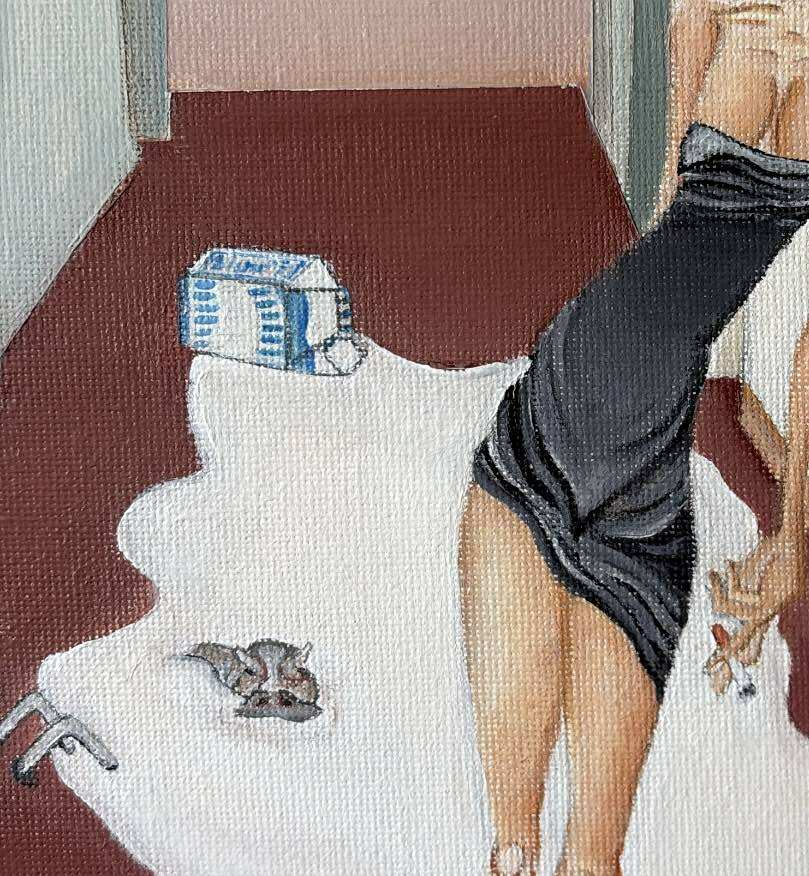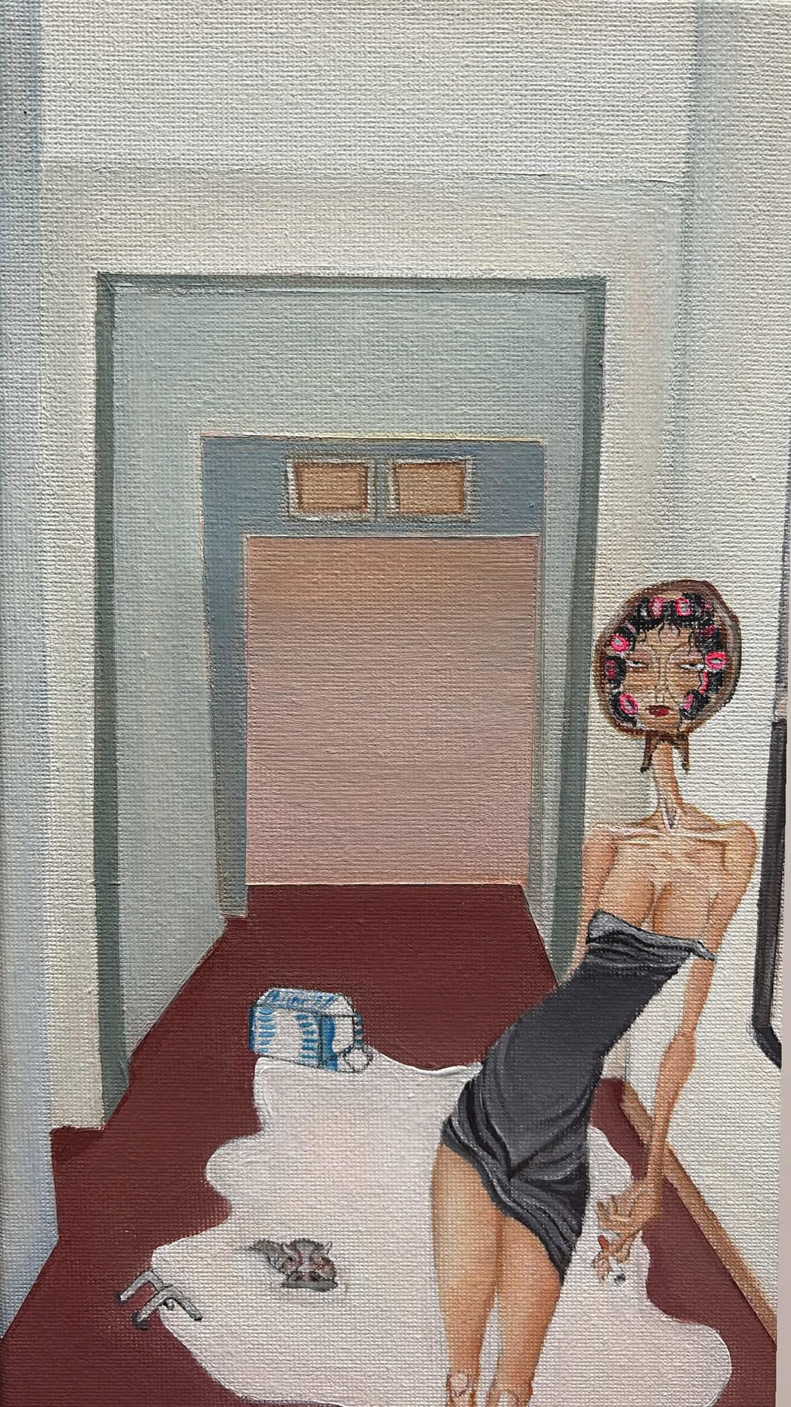 The time I put into this piece is wildly inappropriate for the sheer simplicity it holds... I must say I am so proud of the result. I feel I've perfectly captured those midnight munchie looks, or when you are angry and your clothes get caught on something or when I think of eating at the pool. Or that weird phase of feelings when you're not holding on to old feelings you just haven't found any new ones yet. I thought of this moment in a reaction to being overwhelmed and starved. To be able to just take my things and go is so powerful. So simple... i somehow can't master it so I paint it and paint it again in so many different ways in way to many homes.